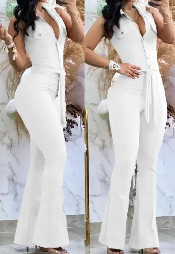 Macacão feminino sexy 2023, gola virada para baixo, sem mangas, skinny, alargado, peça única, roupa da moda, macacão